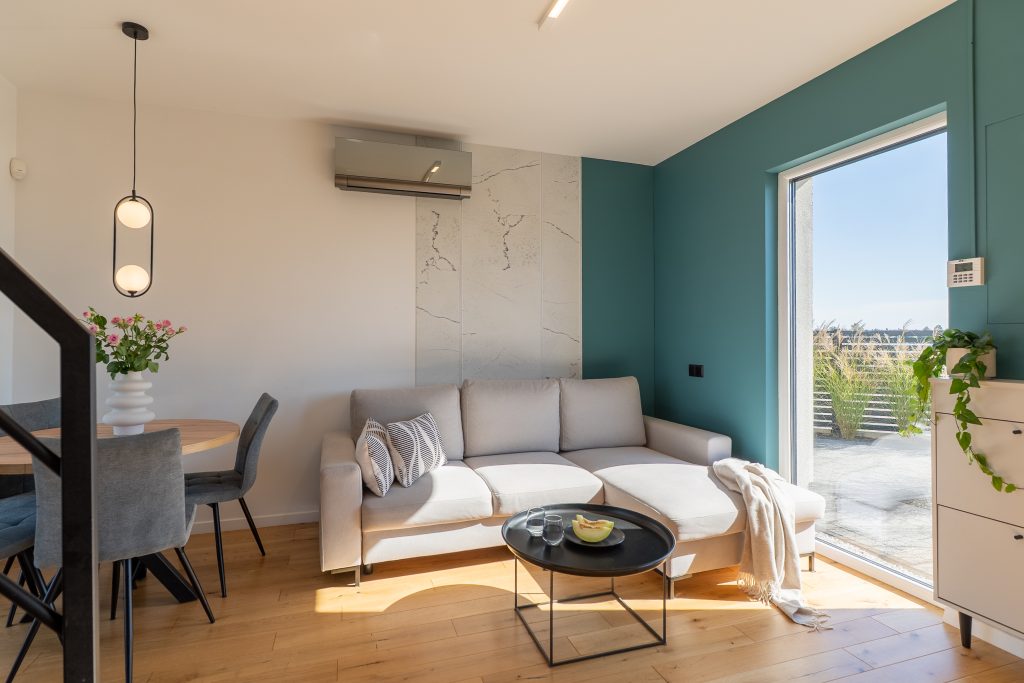 Stylowy salon z panoramicznym widokiem na ogród i jezioro to prawdziwe serce Villi Spalonej. Znajdziesz tu komfortową sofę, Smart TV, klimatyzację i ogrzewanie -idealne warunki, by odpocząć po dniu pełnym atrakcji.